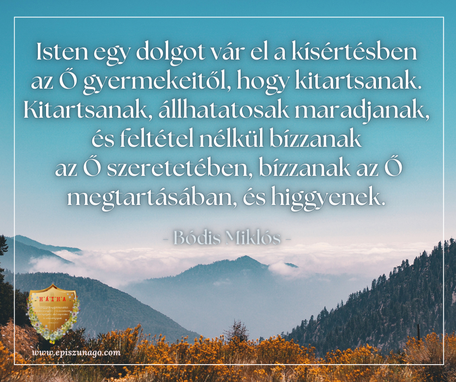 Hír Tarts ki, maradj állhatatos és bízz! szeptember 17, 2022 / „Isten egy dolgot vár el a kísértésben az ő gyermekeitől, hogy kitartsanak. Kitartsanak, állhatatosak maradjanak, és feltétel nélkül bízzanak az Ő szeretetében, bízzanak az Ő megtartásában, és higgyenek.” – Bódis Miklós – Nagyításért kattints a képre!