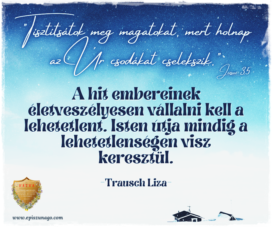Hír „Tisztítsátok meg magatokat, mert holnap az Úr csodákat cselekszik.” Józsué 3,5 november 21, 2022 / „Tisztítsátok meg magatokat, mert holnap az Úr csodákat cselekszik.” Józsué 3,5 Nagyításért kattints a képre! A hit embereinek életveszélyesen vállalni kell a lehetetlent. Isten útja mindig a lehetetlenségen visz keresztül. -Trausch Liza-