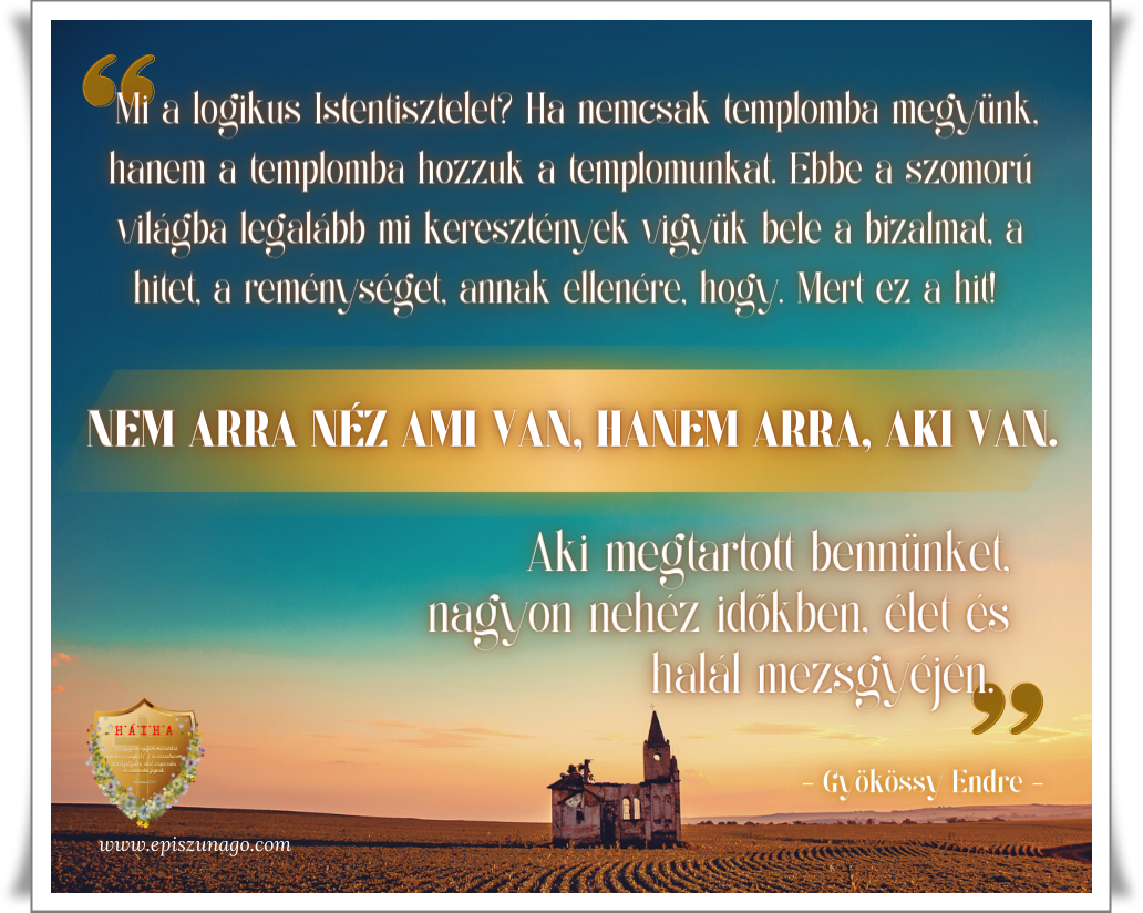 Ha nemcsak templomba megyünk, hanem a templomba hozzuk a templomunkat. Ebbe a szomorú világba legalább mi keresztények vigyük bele a bizalmat, a hitet, a reménységet, annak ellenére, hogy. Mert ez a hit! Nem arra néz ami van, hanem arra, Aki van. Aki megtartott bennünket, nagyon nehéz időkben, élet és halál mezsgyéjén.