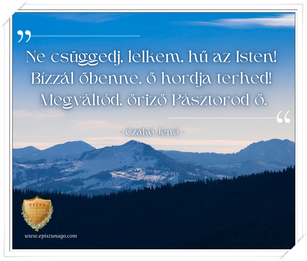 Hír Ne csüggedj, lelkem, hű az Isten! augusztus 2, 2022 / Ne csüggedj, lelkem, hű az Isten! Bízzál őbenne, ő hordja terhed! Megváltód, őriző Pásztorod ő.– Czakó Jenő –